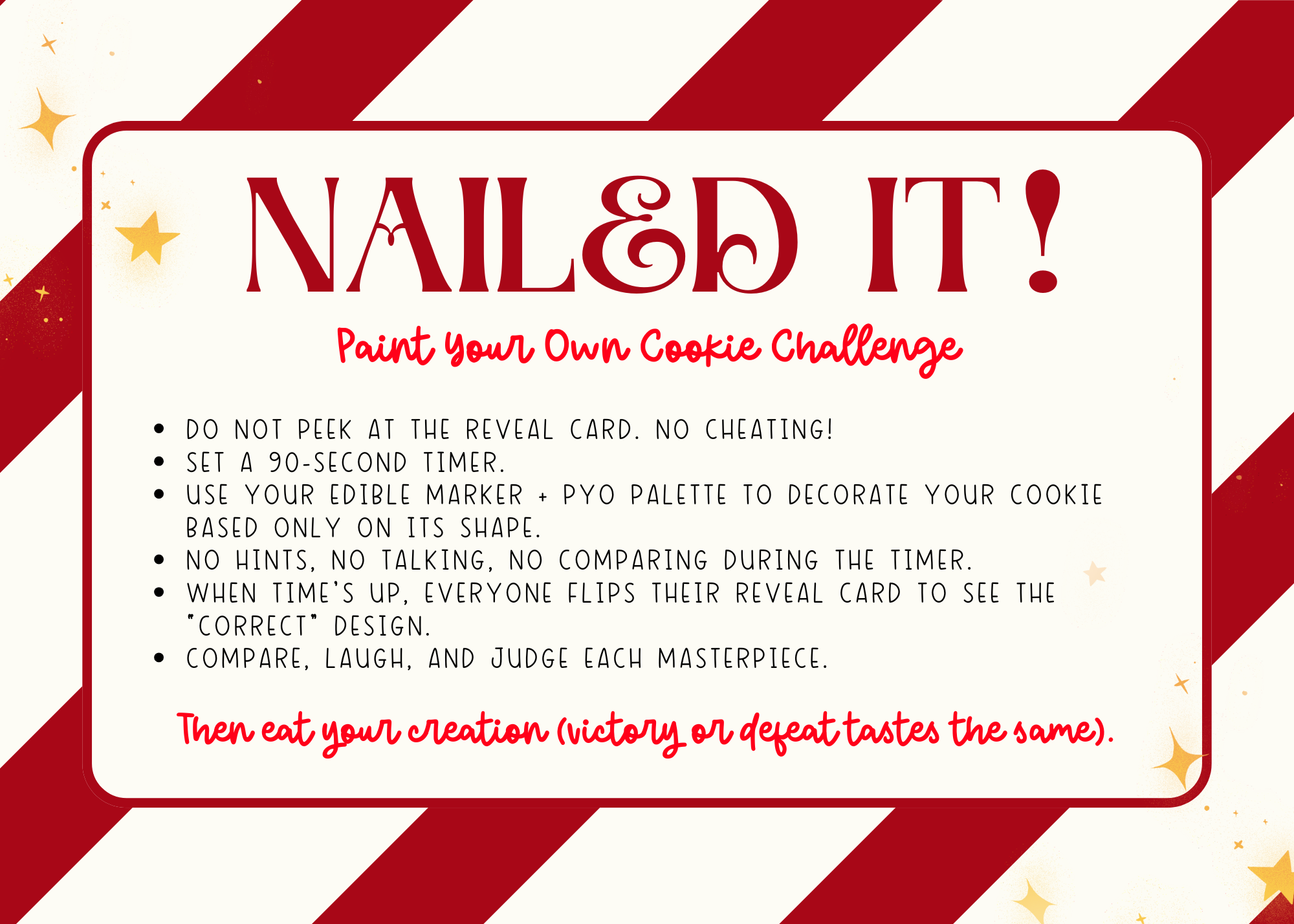 A quick, hilarious decorating game your customers can enjoy with family and friends, and a hit with both kids and grownups! Players decorate a blank cookie without seeing what it’s “supposed” to look like, then reveal the real design when the timer is up. It’s simple, fun, and doesn’t require any stenciling, making it one of the easiest add-on activities you can offer this season.
