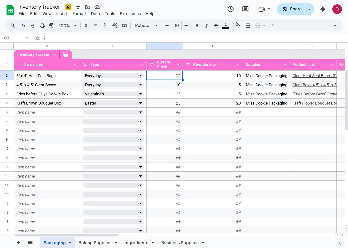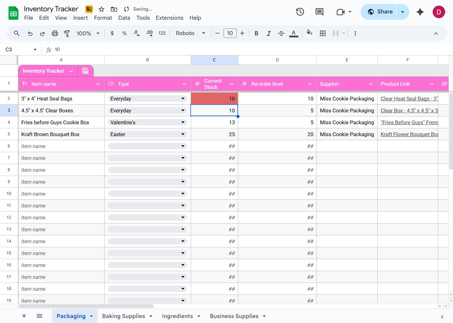 If you always want to reorder clear bags when you hit 25, just type “25” in the reorder column. Once your stock drops to 25 or lower, that row will turn red to remind you it’s time to restock.