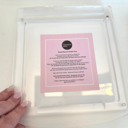 Start by taping your stencil to a frame extender if needed. If your cookies are thicker (around 3/8" dough and closer to 1/2" once iced), the extra height from an XL stencil holder or extender will help you get a clean, even application.