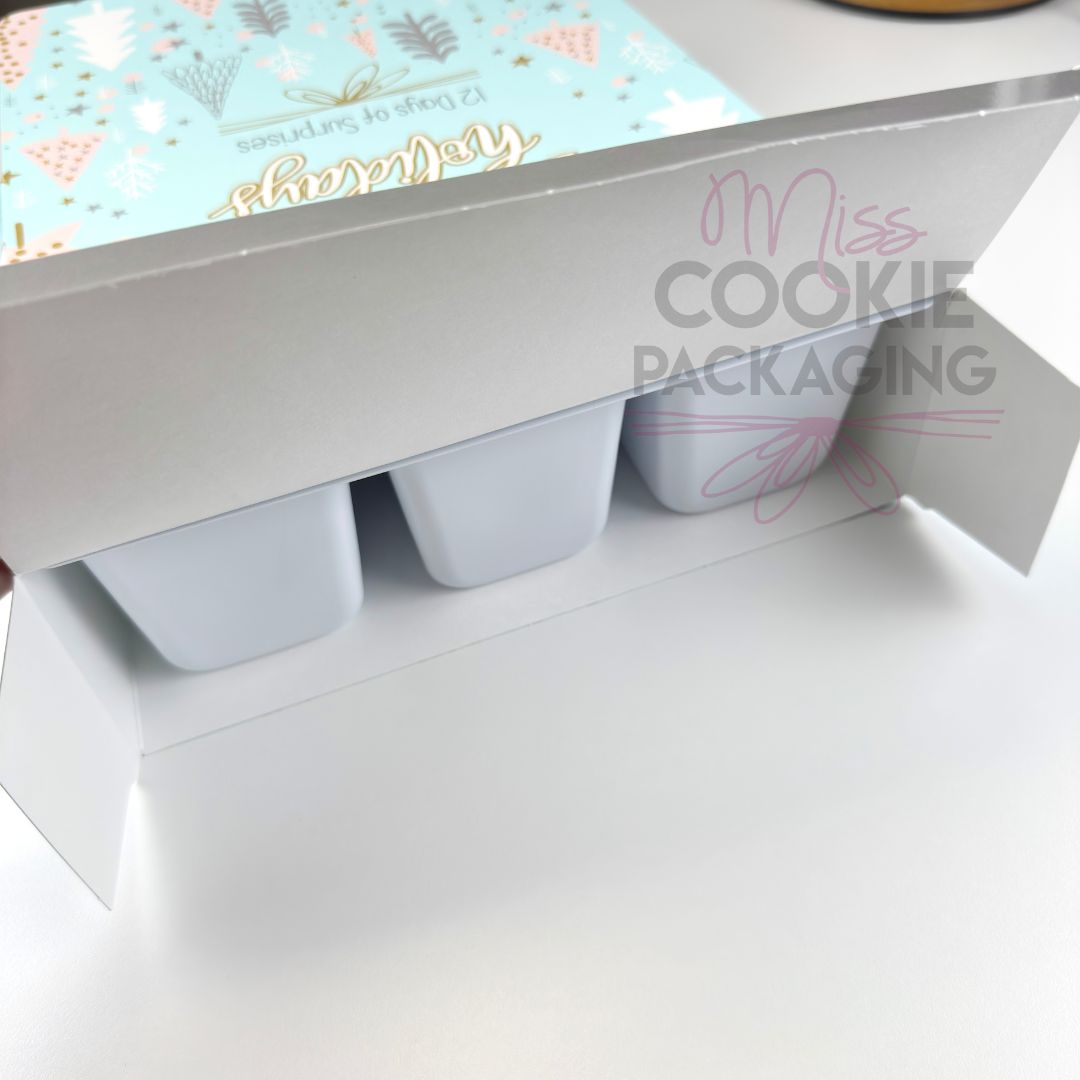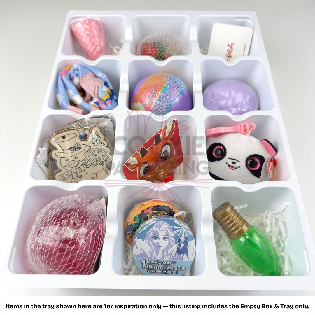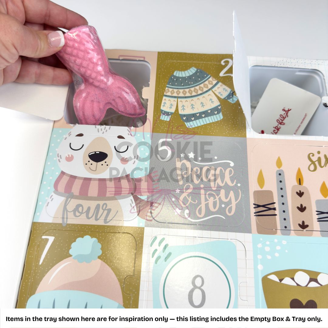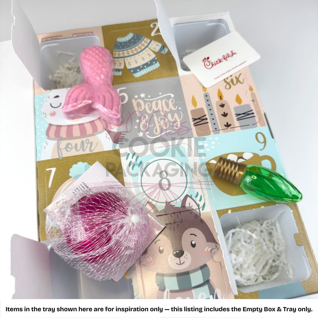 If you’re a Maker of handmade items – use these calendars to sell your items in an Advent calendar this year! The tray can fit things such as hot cocoa bombs, drop cookies, gourmet popcorn, candies, teas, pet treats, soaps, candles, jewelry, multiple mini cookies, and more!
