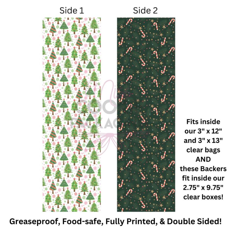 Greaseproof Backer – Dark Green Candy Cane Trees – 9.5″ x 2.625″ (for 3″ x 12″ and 3″ x 13″ Clear Bag)