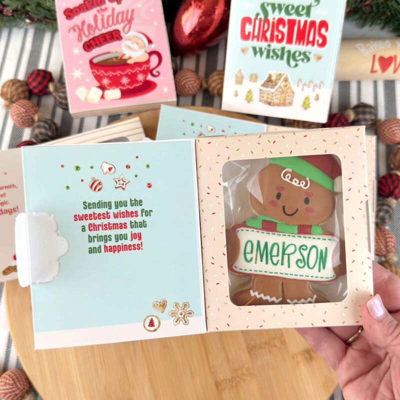 Our cookie greeting cards are a really fun and easy way for you to package up your cookies as gift-able items this busy cookier season! Want to add a gift card to it? Just use glue dots or double sided tape to attach it to the inside cover!